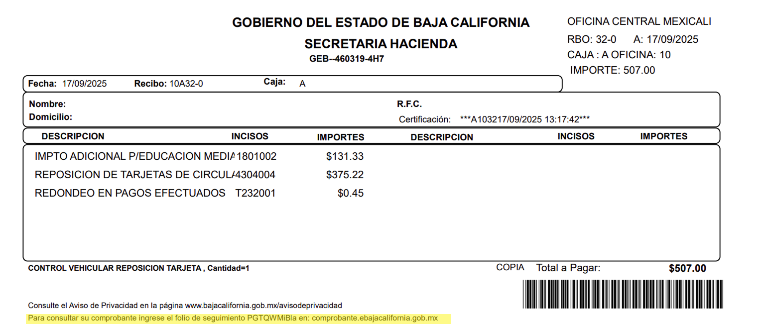 Para consultar su comprobante de pago capture el folio de seguimiento (ubicado en el recibo de la transacción) en: comprobante.ebajacalifornia.gob.mx